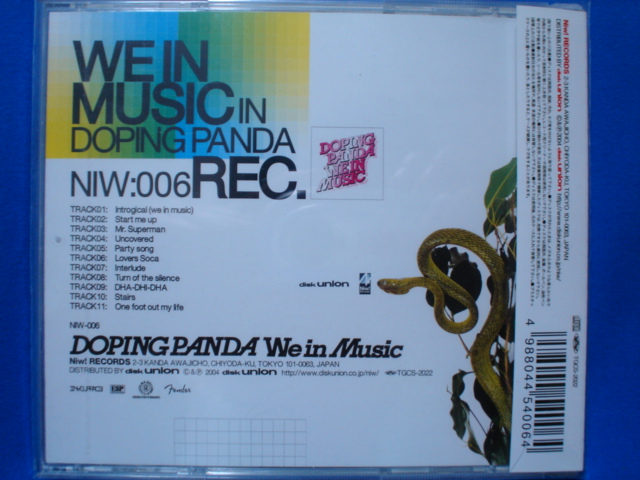今回はDOPING PANDAの2004年作 インディーズ3rdアルバム『We In Music』です。 このバンドはロックとデジタル楽器を融合したバンドで なおかつこのアルバムは ダンス色を強くしていてすごい踊れます! ギターの音がキラキラしてるのも気持ち良いです。 Vo.のFURUKAWAはスターと呼ばれてて 自らもスターと言ってるほど 声(ユルイ系)とメロディーがスターです☆ 個々のテクがすごいのも特徴ですね~ドラム上手いです。 曲の展開、アレンジ゙も良いですねー。 ギターカッティングも心地良い程に歯切れ良く ベースもバランスが良いです♪ さぁスターFURUKAWAの声に酔いしれて下さい(笑) 名曲『Uncovered』収録。。 ロックな毎日